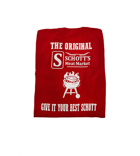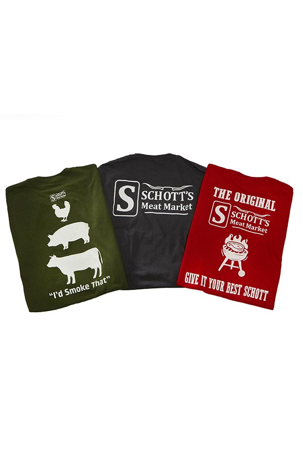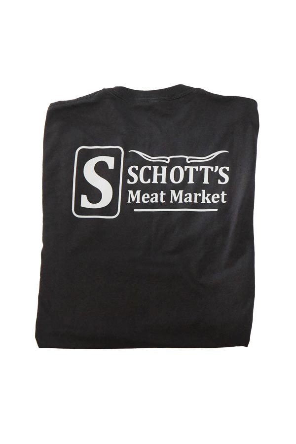 All shirts have Schott’s Meat Market logo on front left chest. Sizes available S, M, L, XL, 2XL